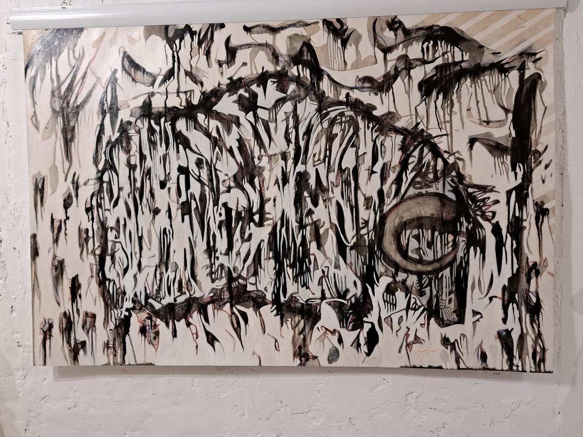 De façon très rapide, avec la volonté de me perdre dans la musique que j’écoute en boucle, volets fermés, je laisse mon imagination déborder sur le support. Étant fidèle à la déconstruction et à la reconstruction, vers la moitié de la réalisation du tableau je le recouvre d’encre de chine noire, un passage du jour à la nuit et de la nuit au jour. Après séchage, je frotte pour faire apparaitre la lumière du noir, ainsi je reconstruis le tableau jusqu’à la fin.